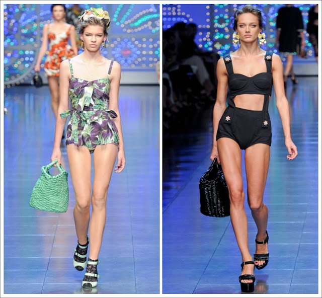 Excitement filled the room at the Dolce & Gabbana Spring/Summer 2012 runway show. The luxury Italian label took a trip to the 1950s and brought back the essence of Southern Italian fashion to their new line. Colourful vegetables, vintage appliques, and extravagant beading were displayed on skirt suits, floaty dresses, and Spring coats. The bandeau tops, high-waisted shorts, corsets, and flirty playsuits are especially appealing elements within this collection. Tres chic !
